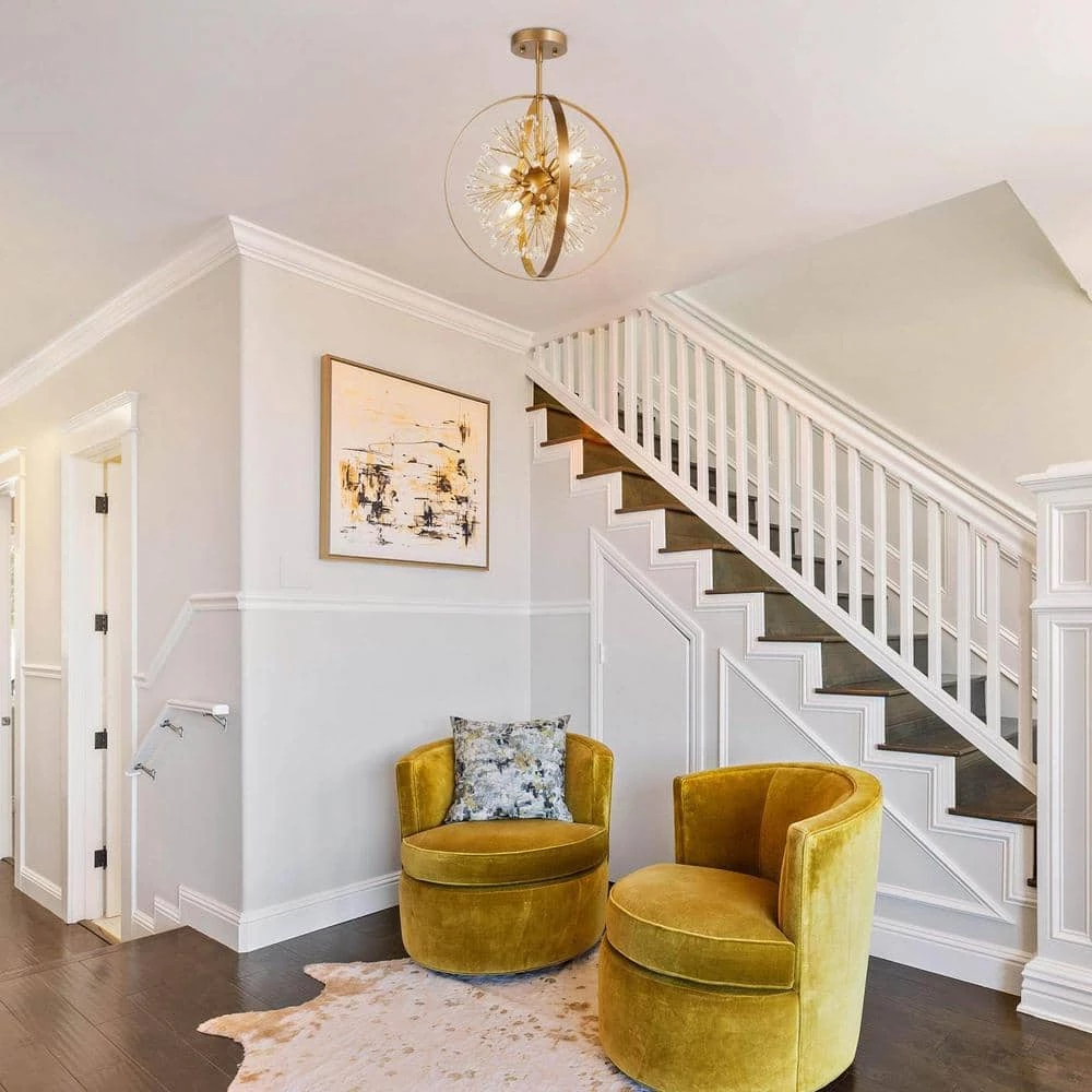 When this Modern Gold Globe Semi-flush Mount Light by Uolfin Lighting enters your home, it brings not only lighting but also a unique little world. This bedroom ceiling light takes gold paints and absorbs both modern and classic design features. The elegant semi-flush mount light is shaped in a cage and sputnik design, spreading a heavy modern retro sense. 4-Light bulbs (not included) are required, with the bulbs arranged radially, and the open design not only allows the light to illuminate your room from all directions but also makes it easy to access bulb replacement to clean dust with a feather duster or clean dry cloth. Whether you are modern, transitional, industrial, minimalist, cottage, farmhouse, or contemporary style, you can easily accept this semi-flush mount light. If you are also looking for such lighting to hang in the living room, bedroom, kitchen, dining room, foyer, corridor, or stairwell, this gold ceiling light will be a versatile choice.