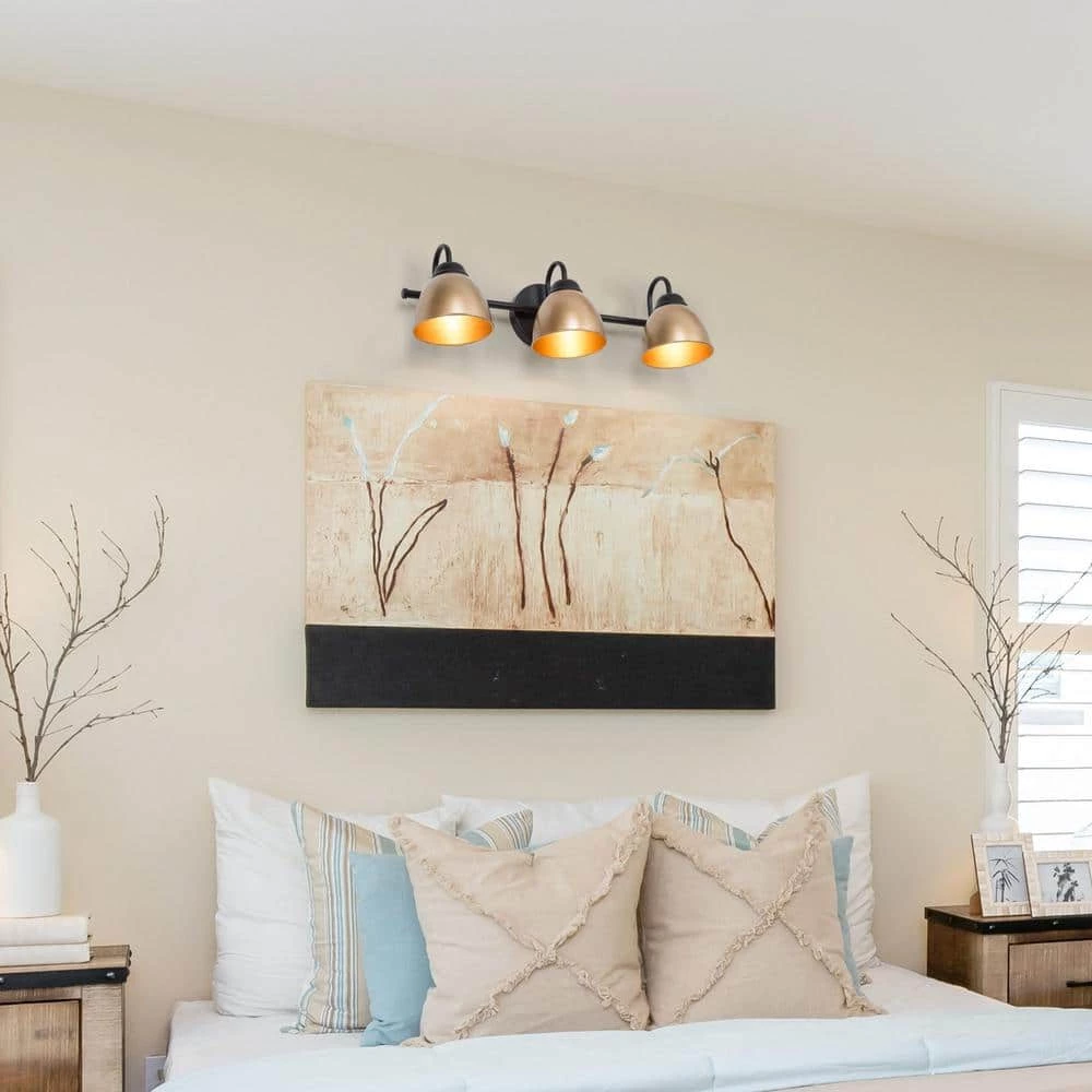 Bring a boost of brightness and sassy Mid-Century Modern charm to your bathroom with this 3-Light Gold Bathroom wall sconce by Uolfin, safely rated for damp locations. Marrying modern and industrial elements, this transitional metal light fixture is coated in gold accents, featuring a round backplate, curved arms, and a slender horizontal bar in a solid finish for a minimalist contemporary feel. This classic yet stylish bath light diffuses light from 3 compatible 40-Watt medium-base bulbs (not included) upward or downward for added customization. It also works with a dimmer switch (not included), allowing you to switch up the lighting whenever inspiration strikes. Perfect for updating the aesthetic of your powder room in the main bedroom or guest room.